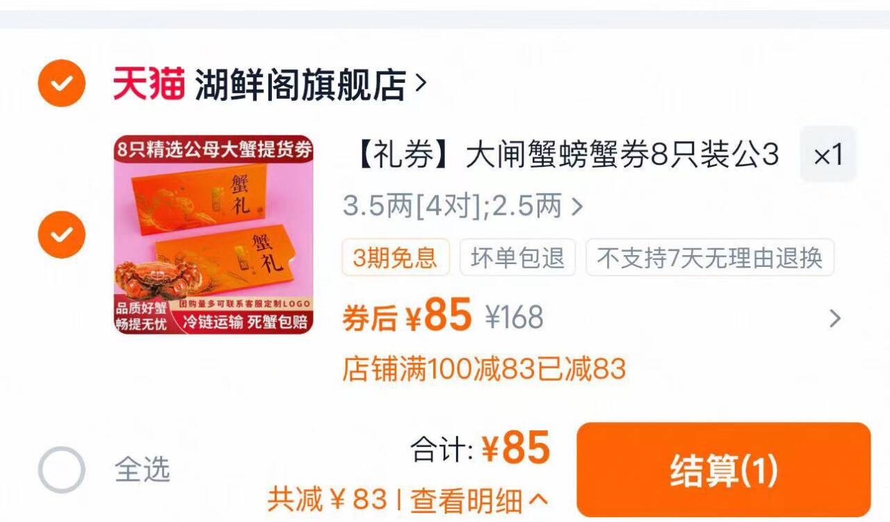 湖鲜阁大闸蟹螃蟹券8只装提货卡