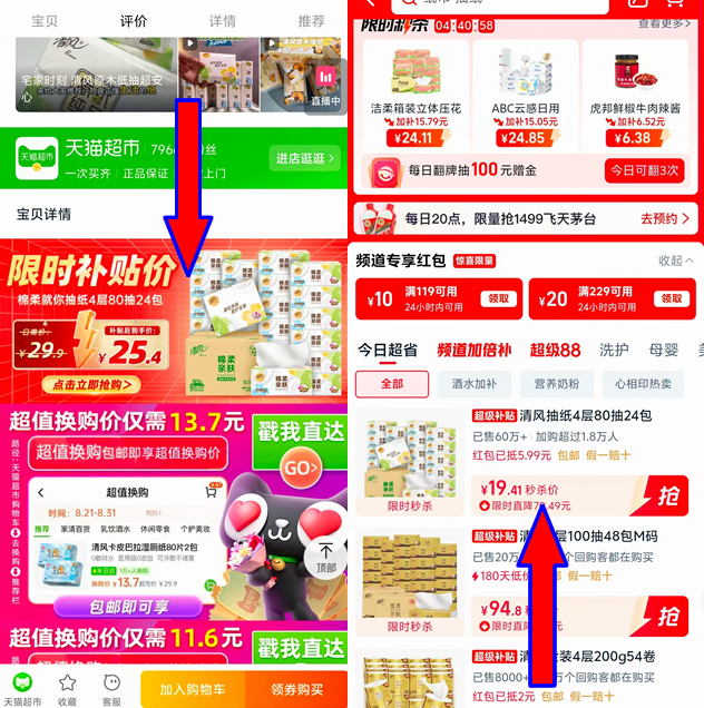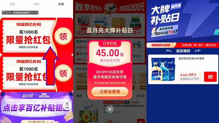 下拉详情【限量抢荭包】,停留几秒弹45亓,去使用拍下