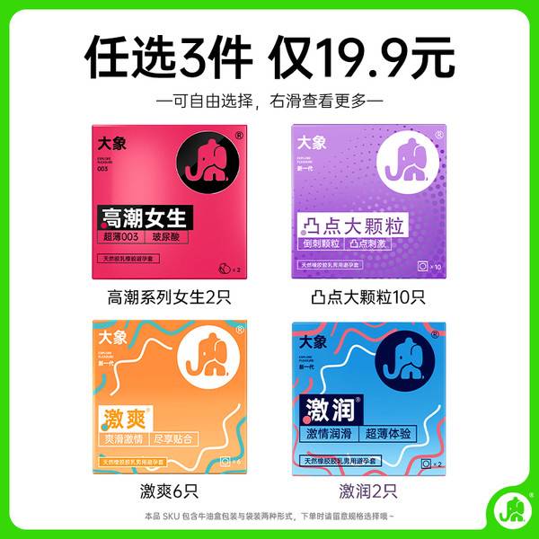 高端货!国庆假期到了速囤! 大象旗舰店•避孕套合集 任选③件19.9亓(上限到手30只) 折6毛/只,外卖一只都要咱8块!! 私密发货!懂得都懂快上车!