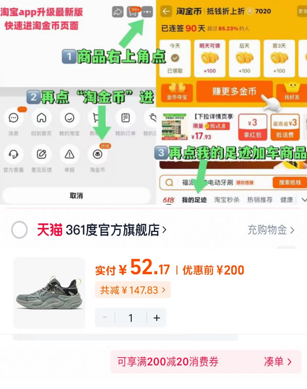 2.商品页右上三个点【···】滑到最右侧,选择【淘金币】进入