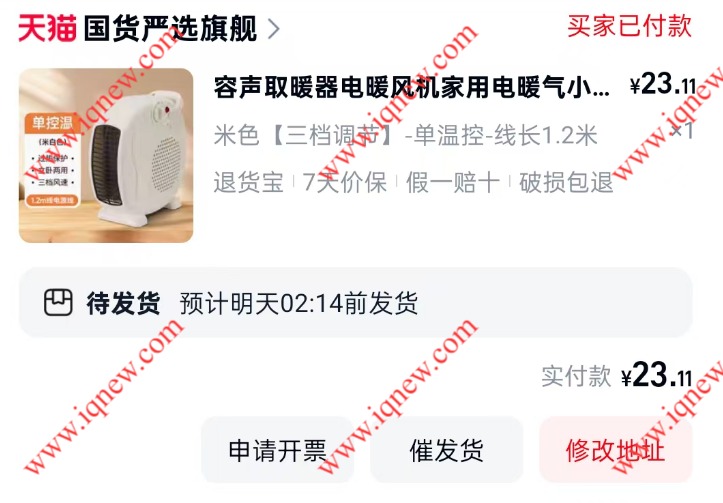 2.天猫APP-我的-顶部【超神卡】领5亓无门槛-购物车-拍下取暖器即可
