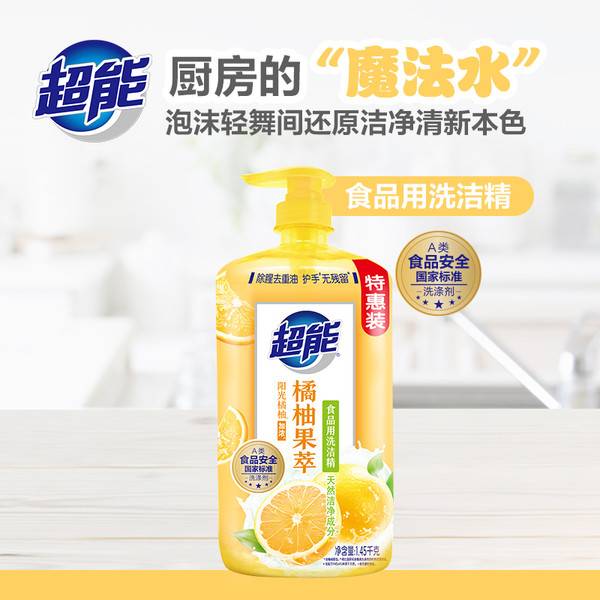 超能大牌离子去油洗洁精!温和不伤手,强效去油不残留,带来清新气味,洗餐具,蔬果等都放心!