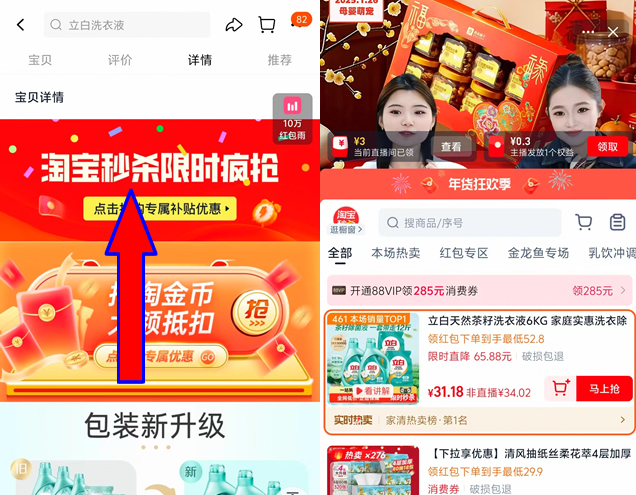 弹礼金+下拉详情【淘宝秒杀限时疯抢】进直播间拍