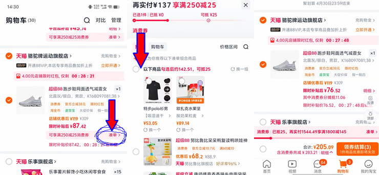 2.去淘宝购物车-勾选鞋子,点右侧【凑单】